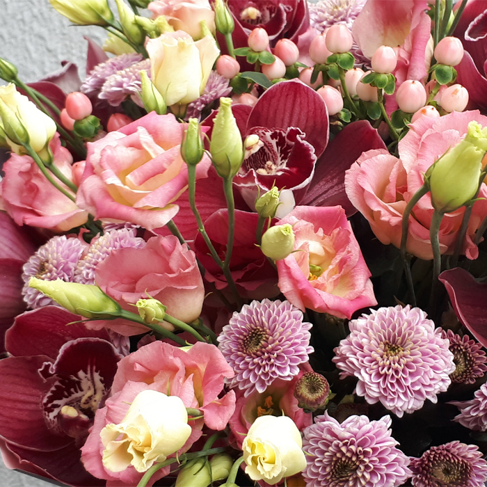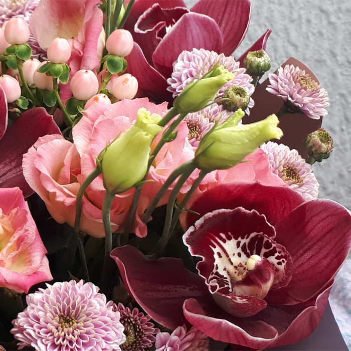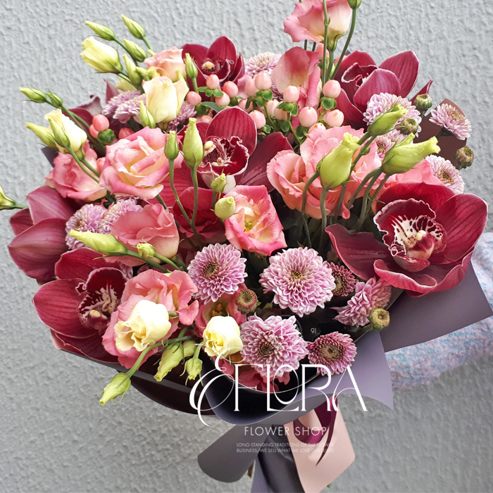 - Нарядный букет из 7 цветков розовой или бордовой орхидеи с эустомой и мелкими шариками хризантемы в декоративной упаковке. Удивит и порадует любую девушку. Букет без роз, все цветы имеют высокую вазостойкость. Букет долго простоим в вазе. Возможна доставка в Минске и в городах Беларуси.