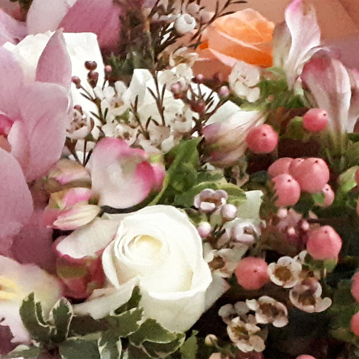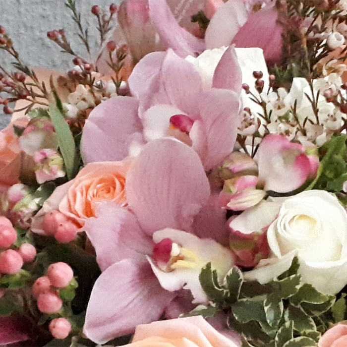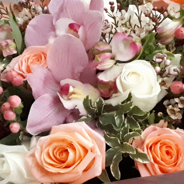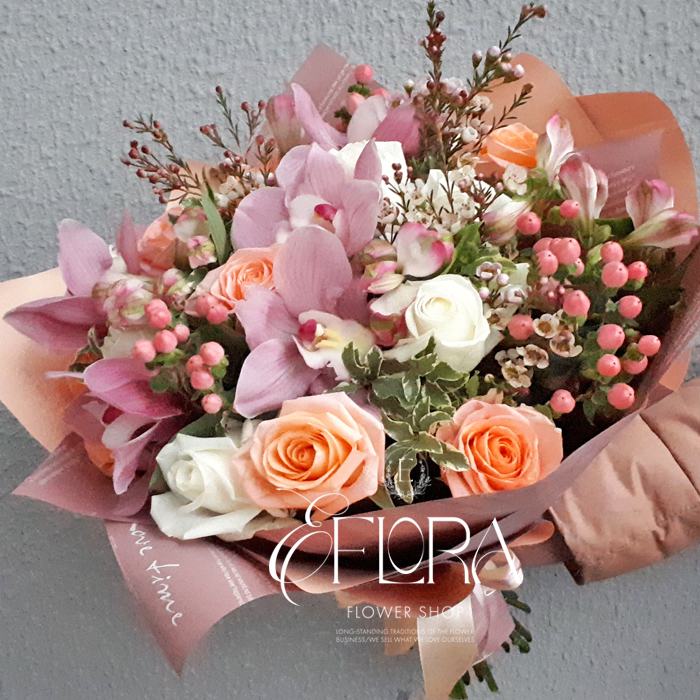 - Большой и необыкновенно завораживающий букет, окутанный тонким ароматом роз со сладковатыми нотками вереска. В составе 5 орхидей, белые и кремовые розы, хамелациум (вереск), гиперикум, альстромерии и разнообразная зелень. Букет крсиво упакован и перевязан атласной лентой.
