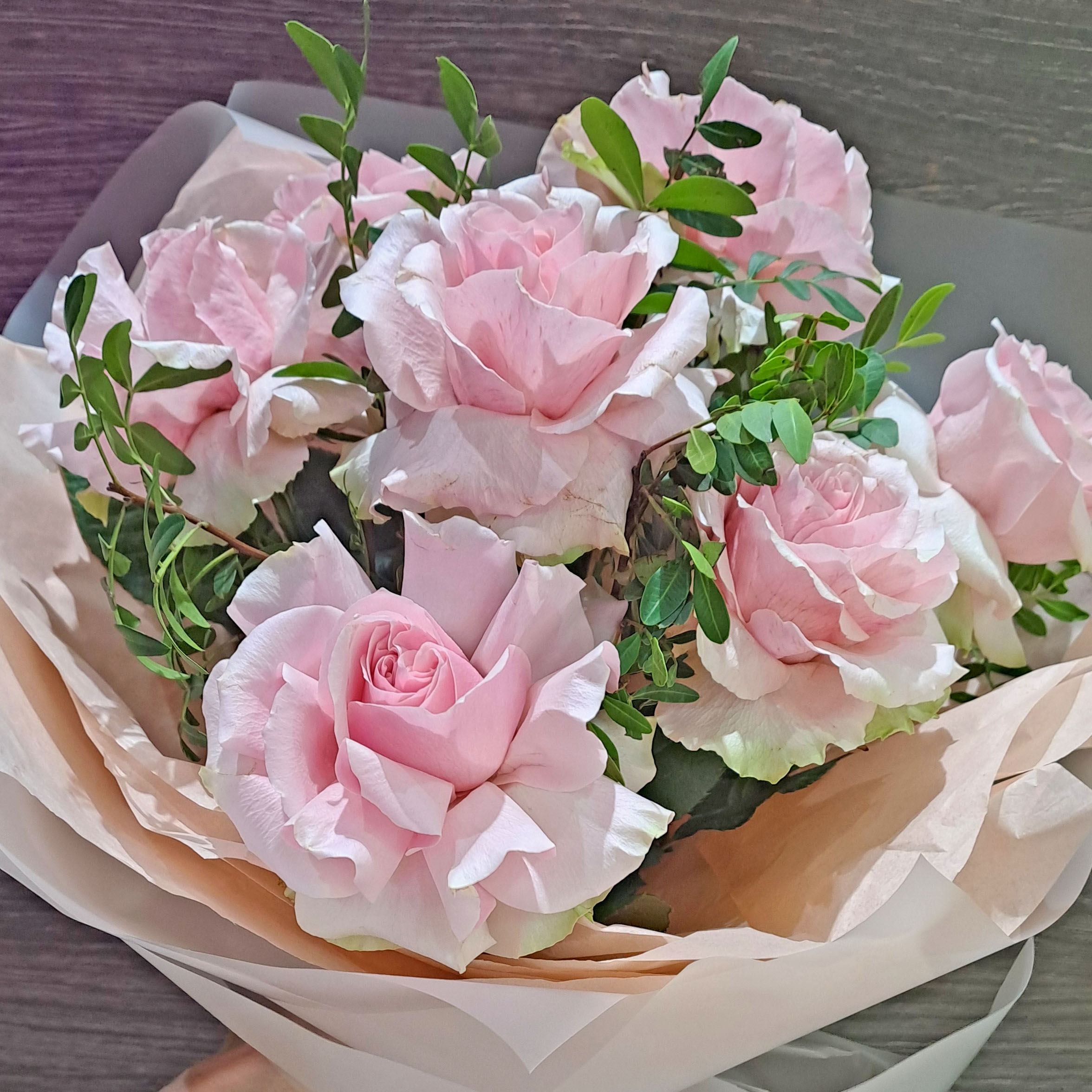 - Букет из 7 розовых французских роз с добавлением зелени в упаковке. Французские розы - это обычные розы, преобразованные руками флориста в большие, с помощью техники выворачивания лепестков.