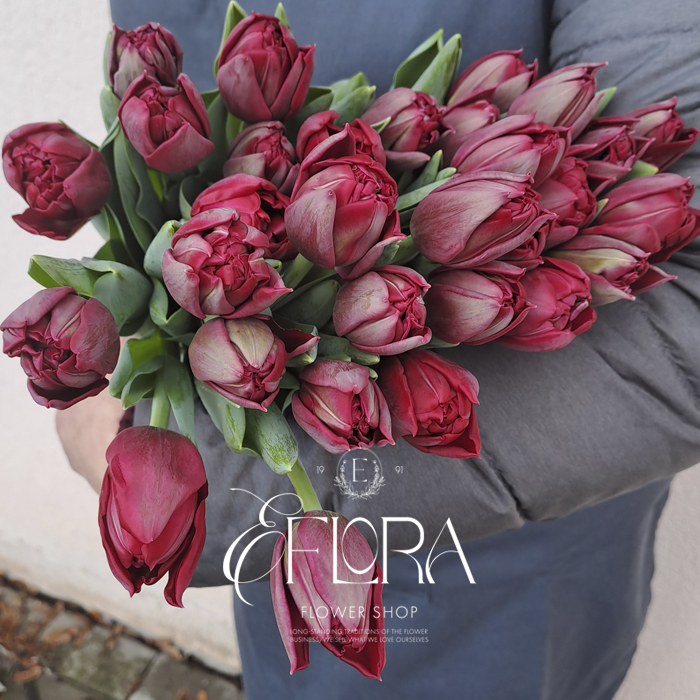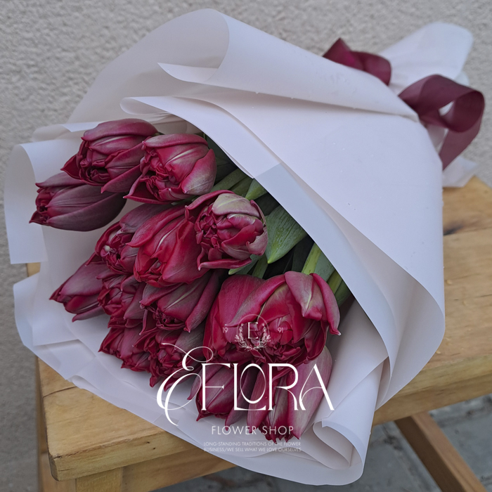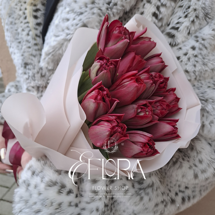 - Красные пионовидные тюльпаны в весеннем букете 15 штук. Праздничная упаковка делает эти весенние цветы прекрасным подарком на 8 марта.