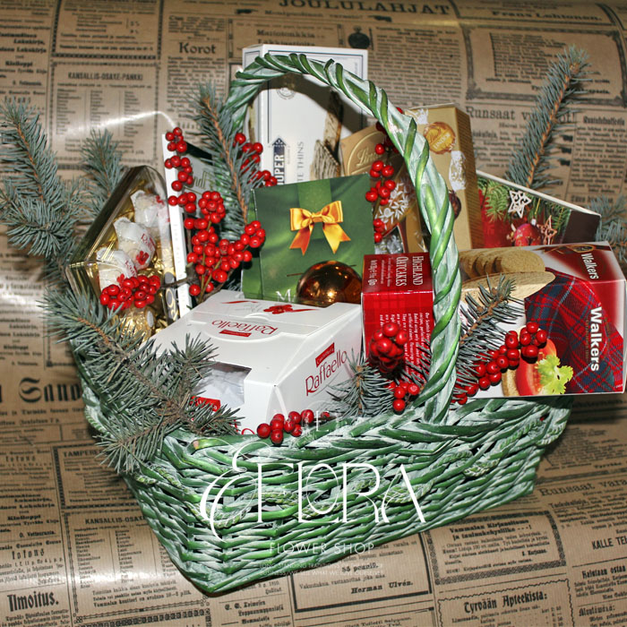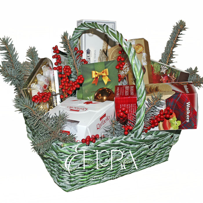 - Новогодняя корзина, празднично оформленная, для любителей вкусненького. В составе: 3 коробки конфет (Рафаэлло, Ферреро и т.п.) и 5 упаковок элитного печенья, шоколада и вафель, новогоднее украшение. В холодные зимние вечера, когда усталость берет своё и согревает только горячий чай, новогодняя корзина-сюрприз порадует вас и ваших близких терпким запахом шоколада и угостит разнообразием сладостей! Поднимет настроение. А особенно понравится сладкоежкам. Наполнение корзины можно изменить по желанию заказчика.
