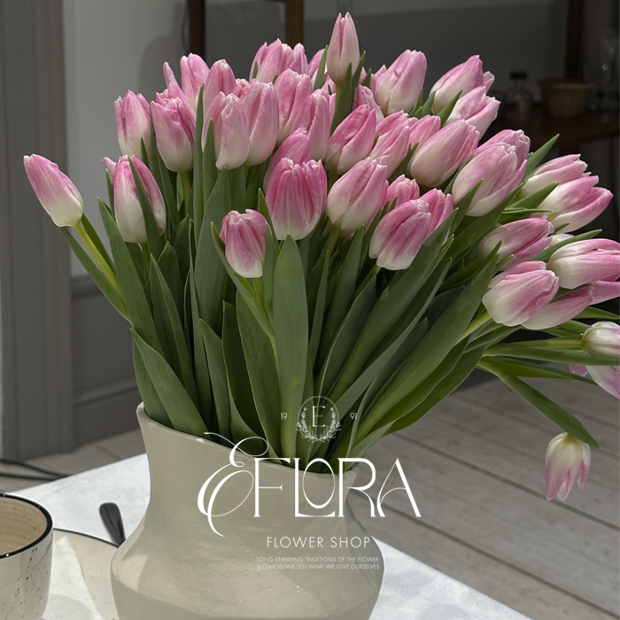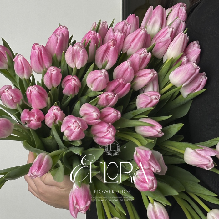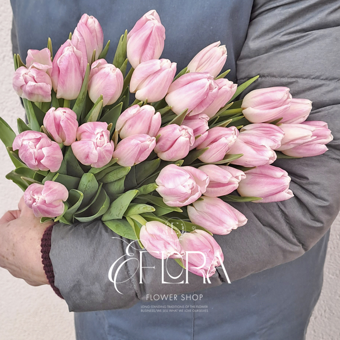 - Весенний букет из 35 розовых тюльпанов. Элегантный, стильный и нежный. Порадует своей свежестью ваших близких. Вариант букета - розовые и белые тюльпаны. Уточняйте наличие оттенков у менеджера. Специальное предложение к 8 марта.