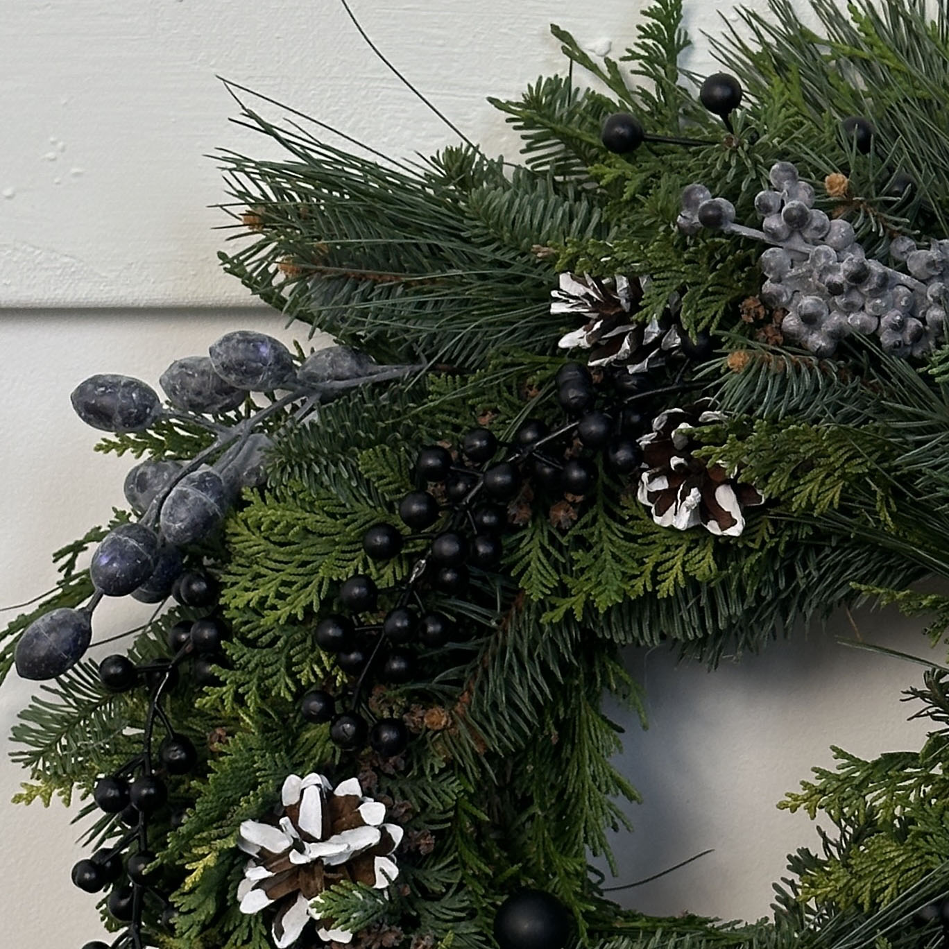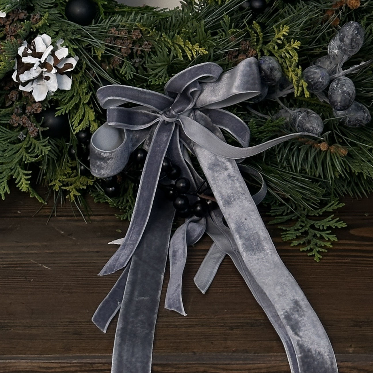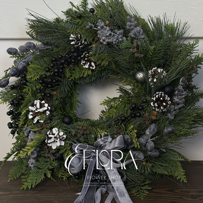- Венок из трех видов хвои со стильным декором, украшен бархатной лентой. Диаметр венка около 30 см.