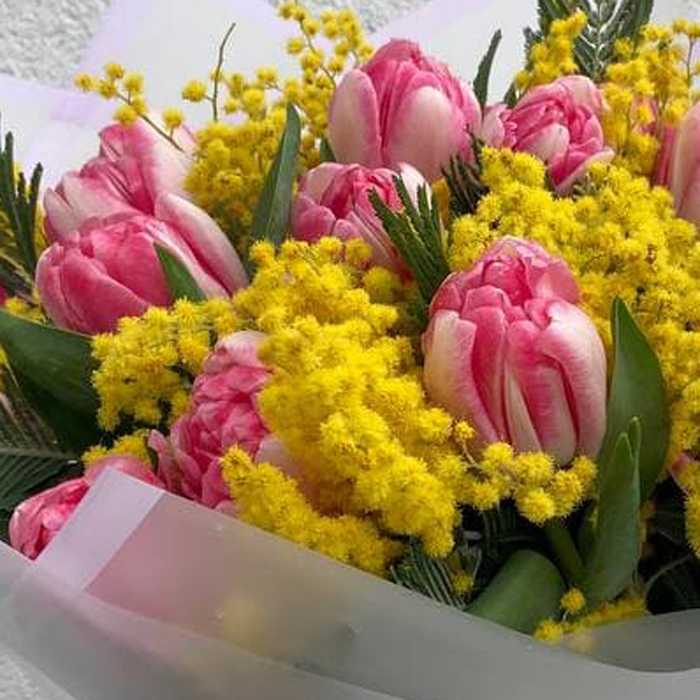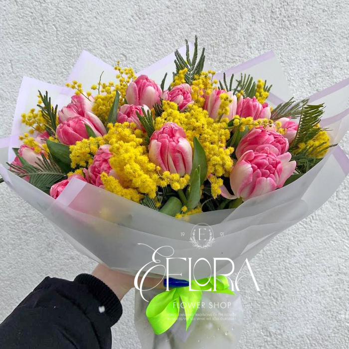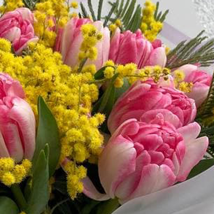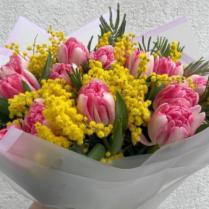 - Букет из 15 бело-розовых пионовидных тюльпанов и мимозы в декоративной упаковке. По вашему желанию цвет тюльпанов может быть любым из имеющихся в наличии. Указывайте свои пожелания в комментариях к заказу.